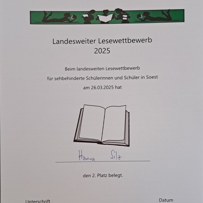 Am Mittwoch, den 26.März 2025, fuhren Meo Antonio Carano und Hannah Silz mit ihrer Schulbegleiterin Bettina Hagedorn („Frau Bettina“) in Begleitung von Frau Steger nach Soest. Da alle Fahrten der Regionalbahn gestrichen wurden, packte Frau Steger uns kurzerhand in ihr Auto und wir düsten über die Autobahn. Hannah und Meo als „Leseraketen“, wie sie sich selbst nannten, gut zufrieden und ein wenig aufgeregt auf der Rückbank.